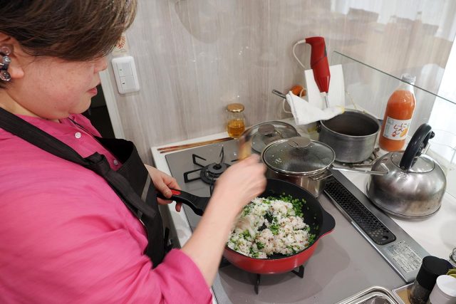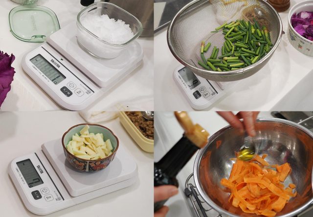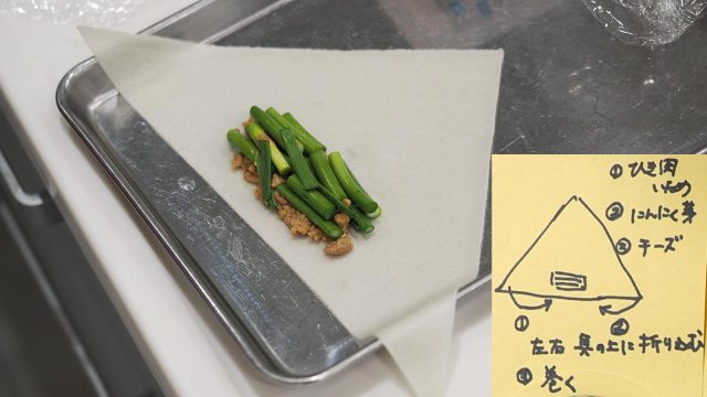 ↑先生は1.5gの塩も、10gのにんにくの芽も、5gのチーズも、小さじ1のオリーブオイルも「はかり」や「軽量スプーン」を使ってしっかり量りながら作っていたのが印象的でした。しっかり計ることで安定した味になる事はもちろん、事前に計画した人数分の料理を不足無くきっちり用意出来る訳です。