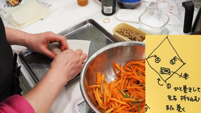 調理前の野菜を少しちぎって生のままの味を確認させてくれたり、少し変わった名前の調味料をスプーンにとって「こんなお味がしますよ」と味見させてくれたり、油の温度や春巻を揚げる際にどの面を下にするか等の細かいコツ・ポイントを教えていただきながら「何か質問ありますか?」と定期的に声をかけていただき、参加者が自由に質問できるやさしい空気の料理教室でした。