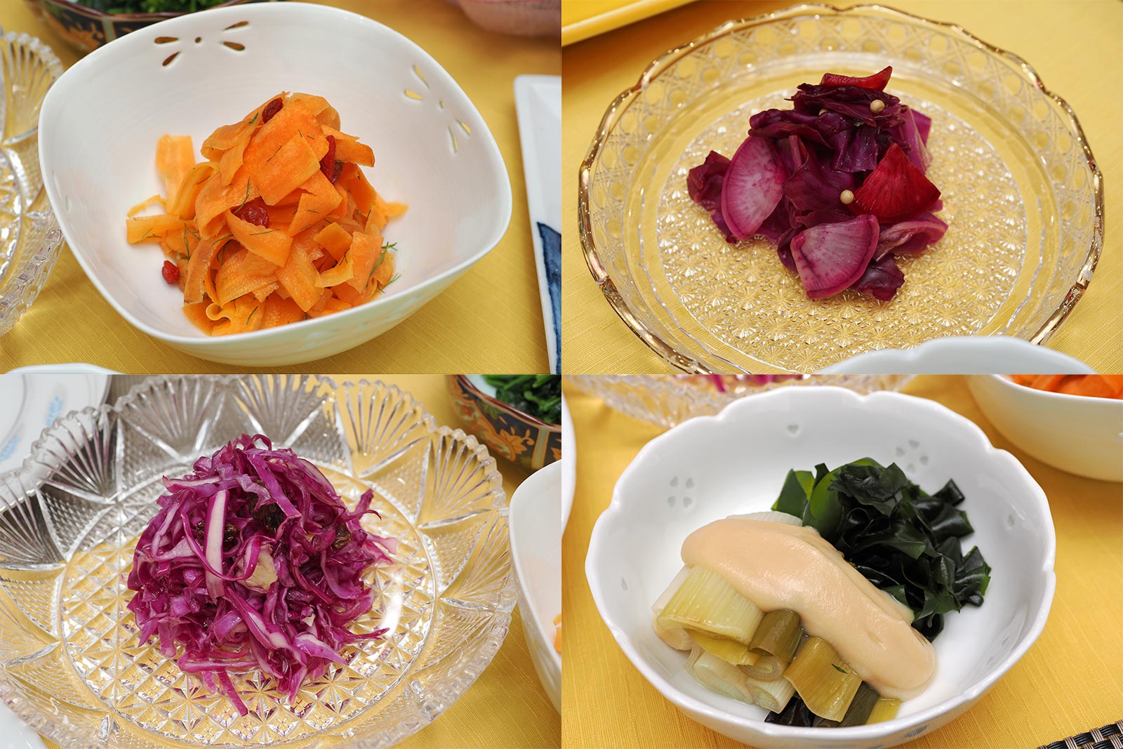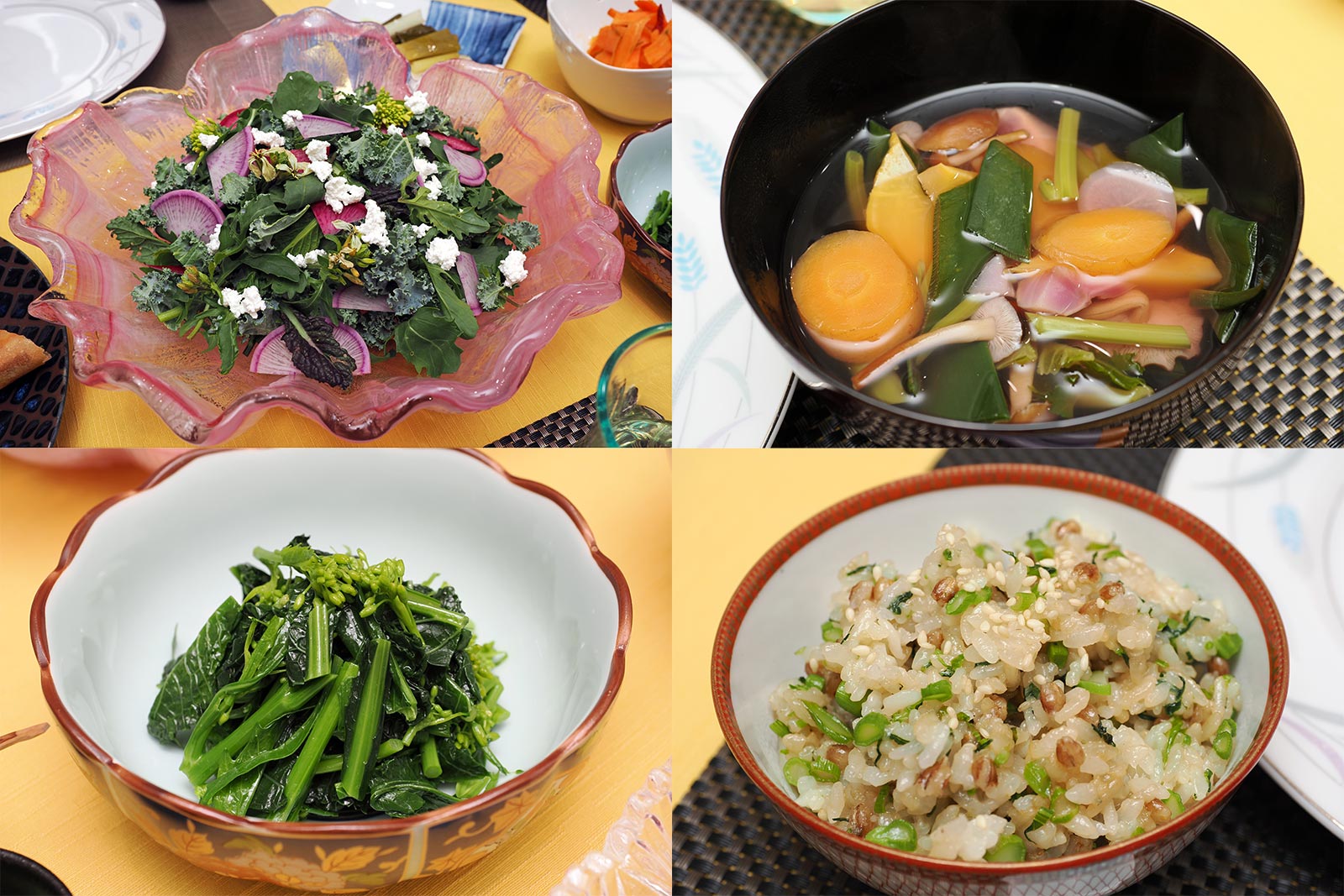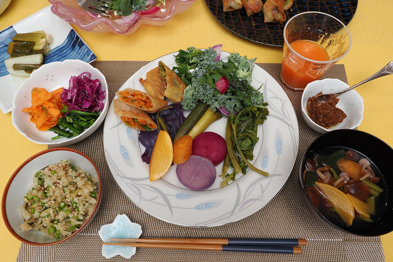 ・高菜チャーハン ・畑の恵みけんちん汁 ・人参春巻 ・にんにくの芽春巻 ・彩りサラダ ・いろいろせいろ蒸し ・長ネギグリル ・紫キャベツ&人参ラペ ・紫キャベツとカラー大根のピクルス ・菜の花2種のナムル
