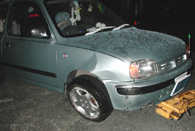 右前のバンパーがはじめに当たり、その後前のホイールがもろにぶつかり、最後に後ろのホイールがぶつかったようです(詳しくは2002年9月9日の日記を見てね)。