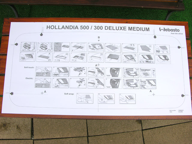 ルーフをカットする時に使う「型紙」に取り付けの説明図が書いてあります。(ちなみに型紙にちらりと書かれているHollandia 500とはHollandia 300を2つ取り付けてツインルーフにするキットで日本では未発売のモデル)