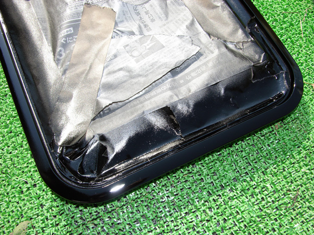 ↑車内側。車内側のフレームに付いている防水用のシール材を傷付けないように&スプレーがかからないように、かつシール材がはがれてしまわないようにやや弱めのマスキングテープでマスキングしてください。
